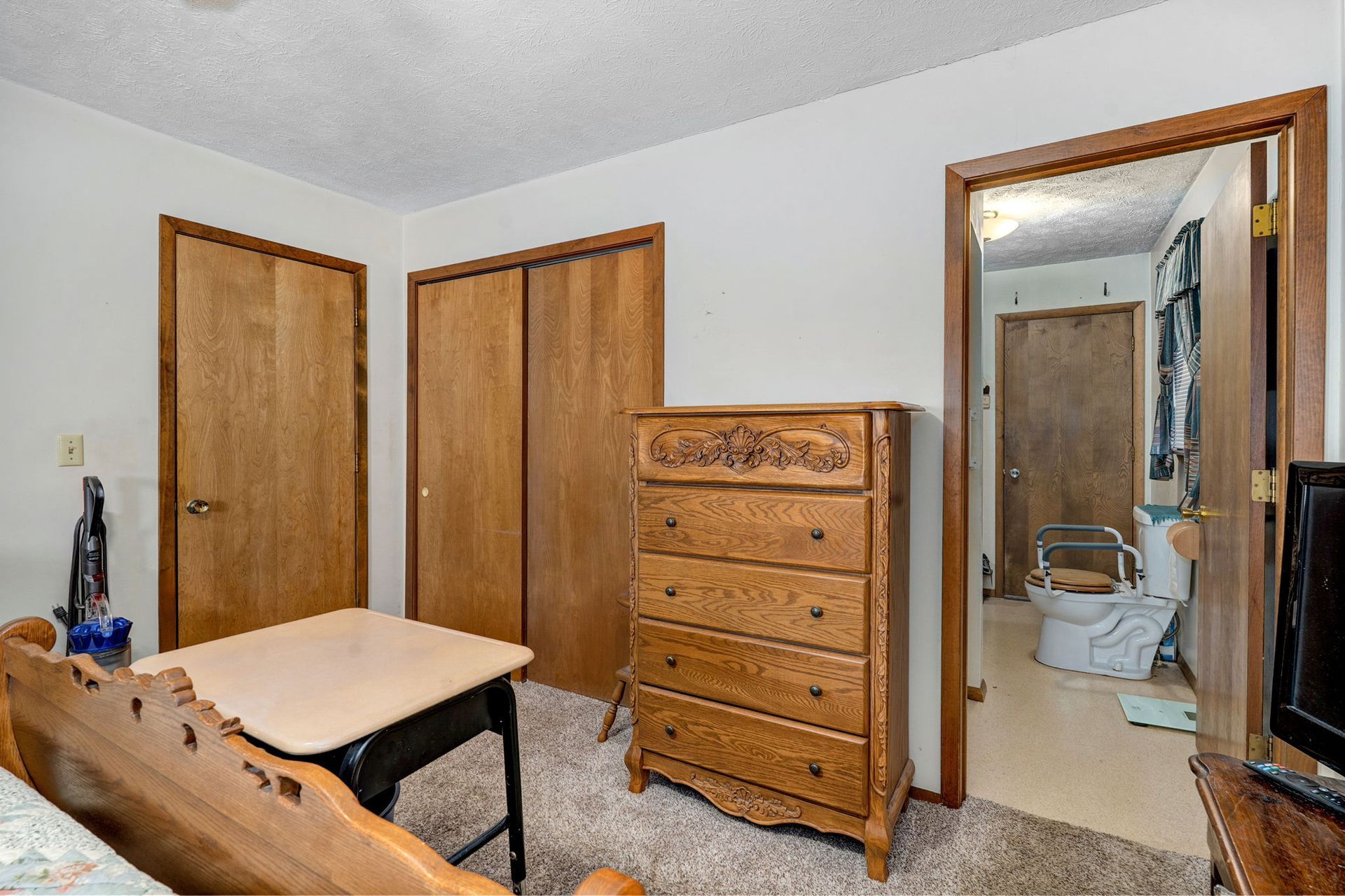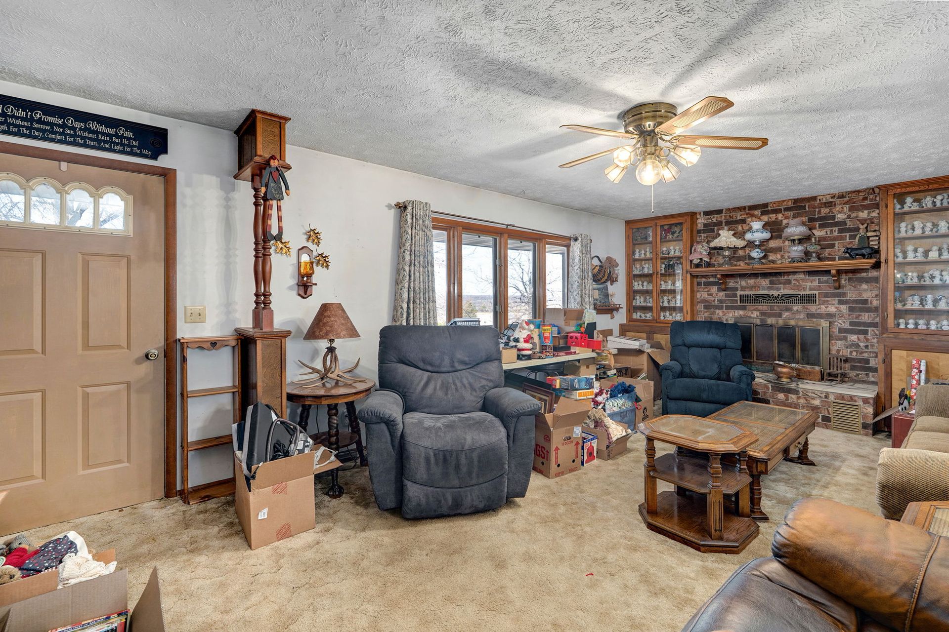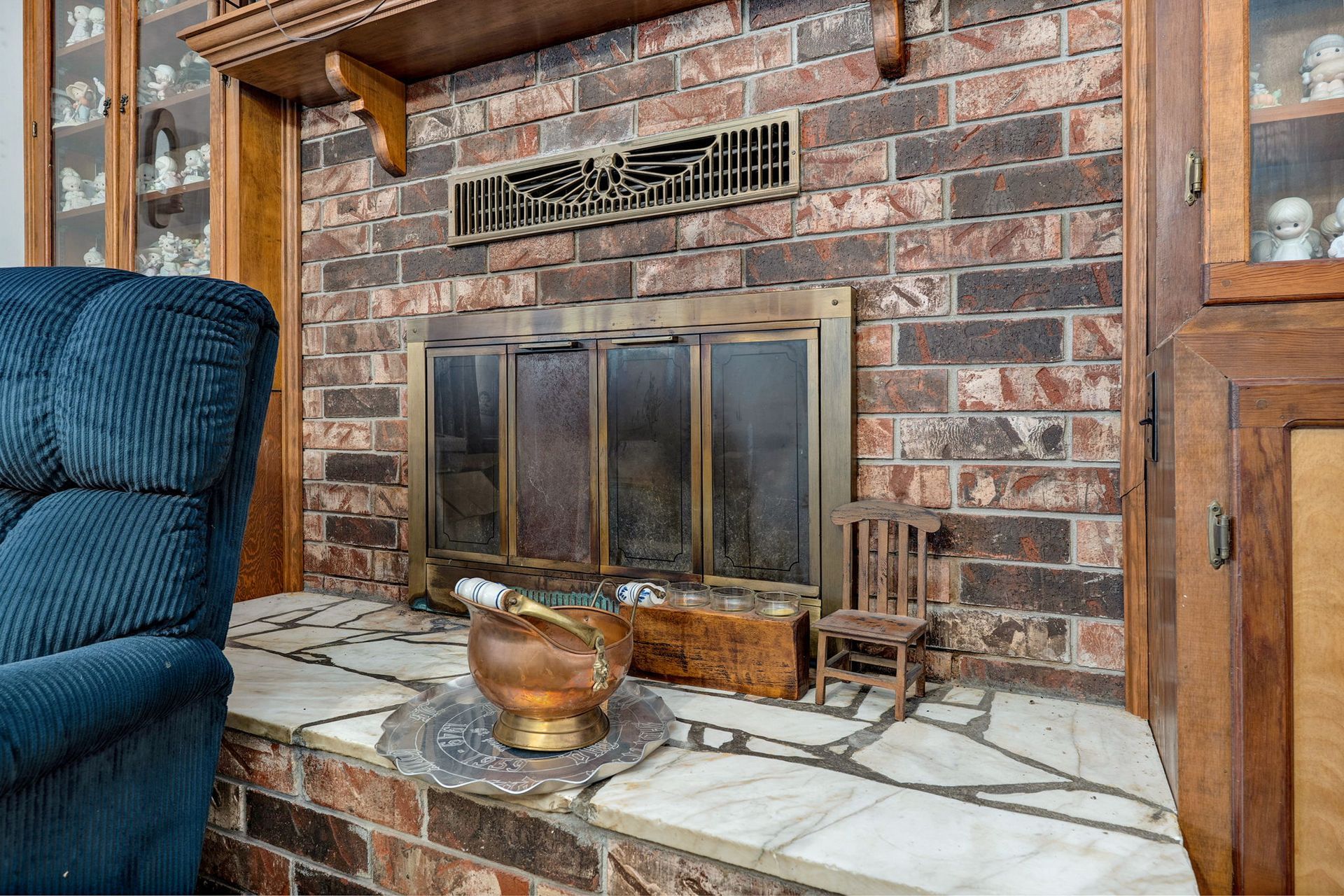 The home is designed for optimal storage, with built-in shelving and linen closets. Wood-burning fireplace with brick surround and granite hearth creates a warm focal point in the living space. Access to the partially finished basement reveals additional living space, which includes a third bedroom, a partial finished secondary living room, and a dedicated storage area.