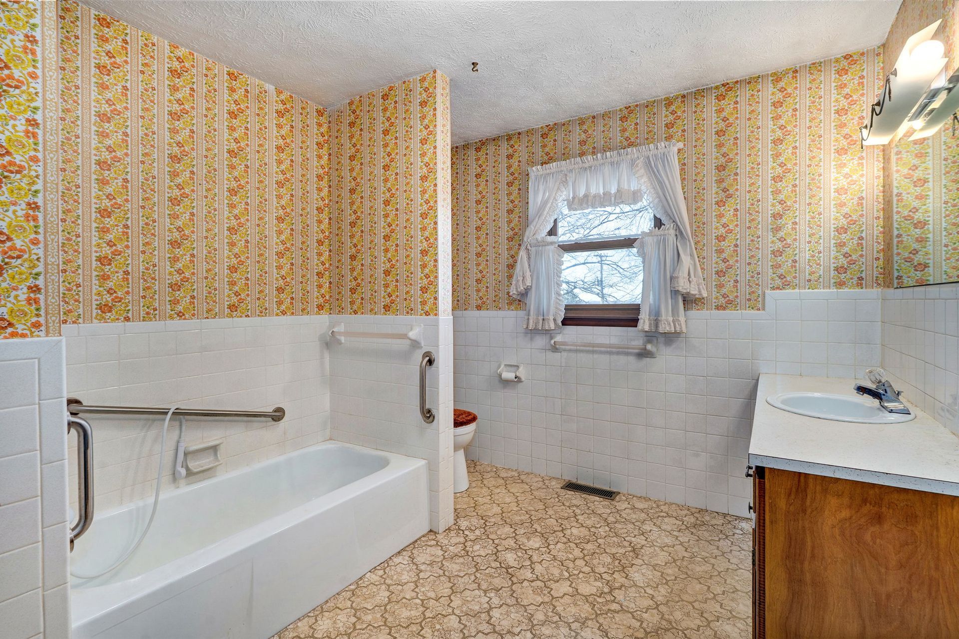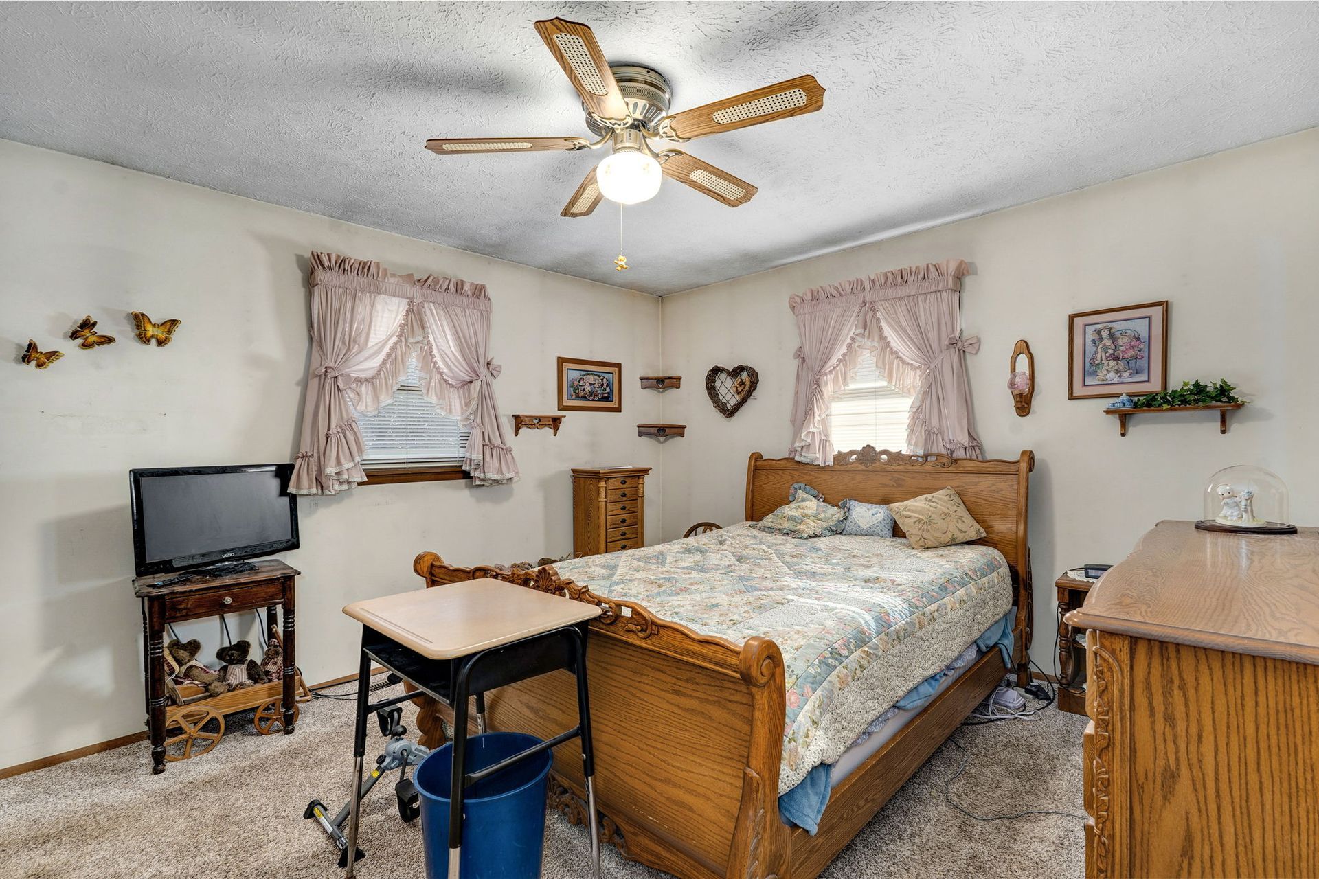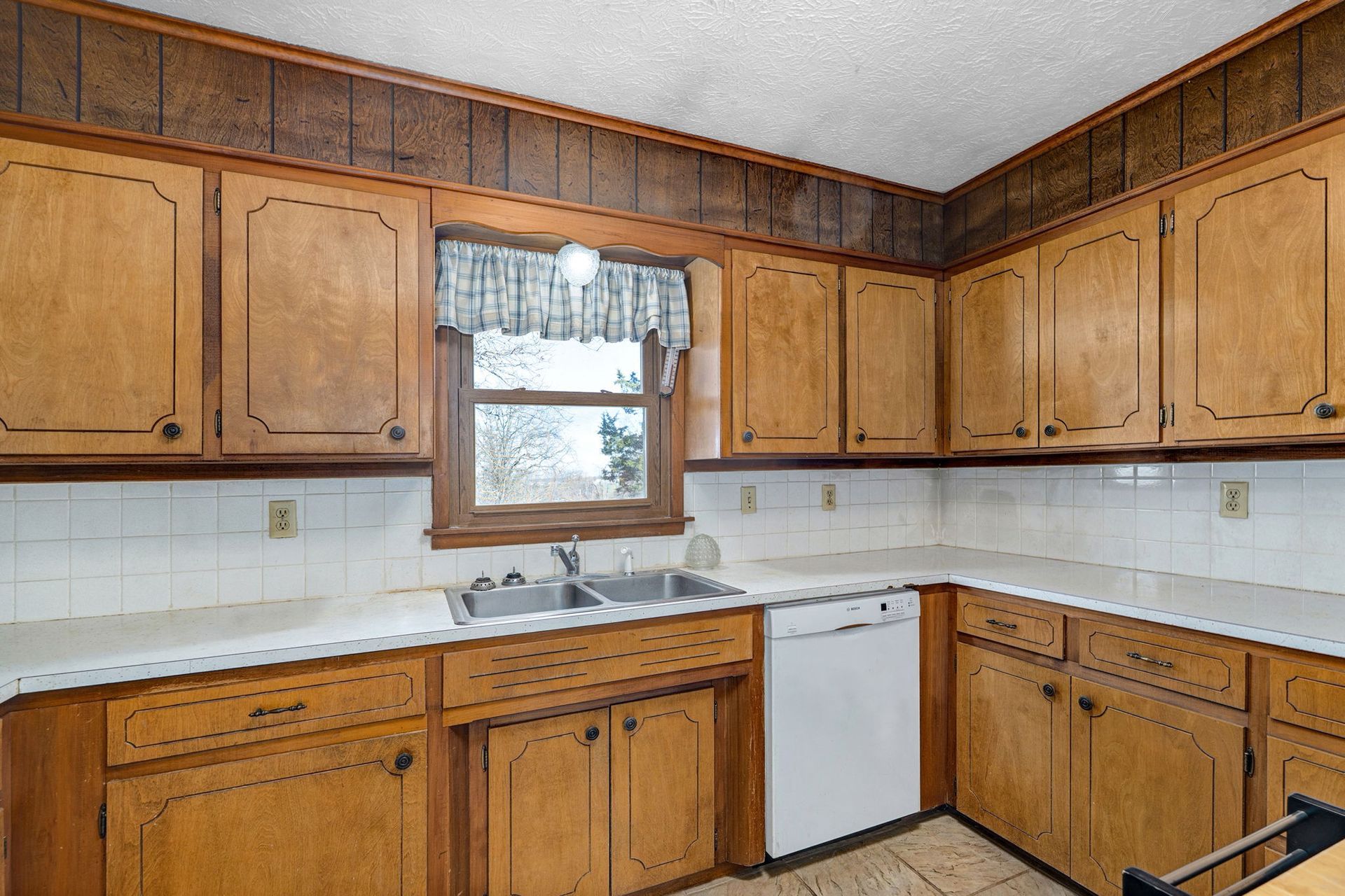 This all-brick residence offers three bedrooms and two full bathrooms, perfectly combining comfort and functionality with close proximity to city limits. The kitchen/dining combo features an electric oven range, built-in microwave, and Bosch dishwasher, accented by oak cabinetry. The flooring throughout includes a blend of tile, carpet, and linoleum.